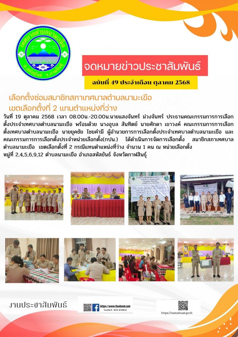 รายละเอียด : วันที่ 19 ตุลาคม 2568 เวลา 08.00น.-20.00น.นายแสงจันทร์ ม่วงจันทร์ ประธานคณะกรรมการการเลือก ตั้งประจำเทศบาลตำบลนามะเขือ พร้อมด้วย นางอุบล สันทิตย์ นายศักดา เขาวงค์ คณะกรรมการการเลือกตั้งเทศบาลตำบลนามะเขือ นายยุคชัย ไชยคำมี ผู้อำนวยการการเลือกตั้งประจำเทศบาลตำบลนามะเขือ และ คณะกรรมการการเลือกตั้งประจำหน่วยเลือกตั้ง (กปน.) ได้ดำเนินการจัดการเลือกตั้งสมาชิกสภาเทศบาล ตำบลนามะเขือ เขตเลือกตั้งที่ 2 กรณีแทนตำแหน่งที่ว่าง จำนวน 1 คน ณ หน่วยเลือกตั้ง หมู่ที่ 2,4,5,6,9,12 ตำบลนามะเขือ อำเภอสหัสขันธ์ จังหวัดกาฬสินธุ์