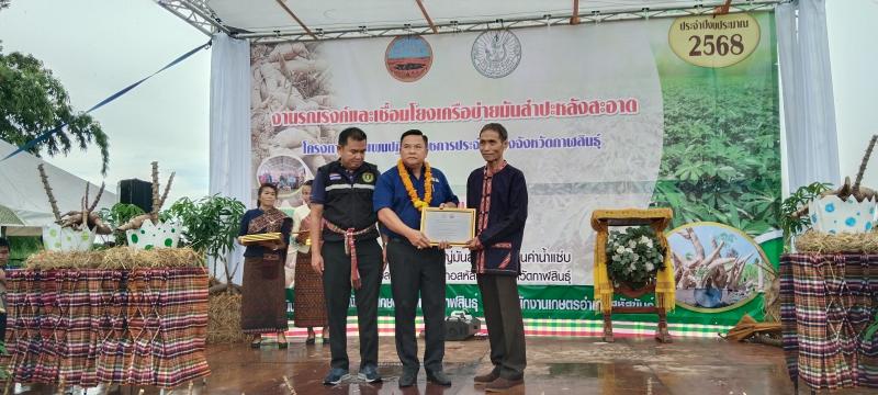 รายละเอียด : วันที่ 5กันยายน 2568 เวลา 11.00น.นายสนัน พงษ์อักษร ผู้ว่าราชการจังหวัดกาฬสินธุ์ ประธานพิธีเปิด งานรณรงค์และเชื่อมโยงเครือข่ายมันสำปะหลังสะอาด โครงการเพิ่มประสิทธิภาพการผลิตพืชเศรษฐกิจหลัก สร้างความมั่นคงเศรษฐกิจฐานรากภาคการเกษตร กิจกรรมหลัก พัฒนาศักยภาพการผลิตมันสำปะหลังคุณภาพ เสริมสร้างความมั่นคงพืชเศรษฐกิจ โครงการภายใต้แผนปฏิบัติราชการประจำปีของจังหวัดกาฬสินธุ์ ประจำปีงบประมาณ พ.ศ.2568 โดยมี นางสาวกัญญาภัค แจ่มใส นายอำเภอสหัสขันธ์ กล่าวต้อนรับ นายพิมพ์ นันประดิษฐ์ นายกเทศมนตรีตำบลนามะเขือ กล่าวรายงานสภาพพื้นที่ และนายคมกริช ไตรยศ เกษตรจังหวัดกาฬสินธุ์ กล่าวรายงานการจัดงาน โดยมีวัตถุประสงค์เพื่อส่งเสริมและพัฒนาให้เกิดเครือข่ายผู้ผลิตมันสำปะหลัง เชื่อมโยงการผลิตและการตลาด กลุ่มเป้าหมายเกษตรกร จำนวน 200 ราย พร้อมด้วย หัวหน้าส่วนราชการจังหวัดกาฬสินธุ์ หัวหน้าส่วนราชการอำเภอสหัสขันธ์ คณะผู้บริหารเทศบาล สมาชิกสภาเทศบาล ผู้นำฝ่ายปกครอง โรงพยาบาลส่งเสริมสุขภาพตำบลนามะเขือ โรงเรียนนามะเขือพัฒนศึกษา กลุ่มแปลงใหญ่มันสำปะหลังในจังหวัดกาฬสินธุ์ เกษตรกรตำบลนามะเขือ เข้าร่วมกิจกรรมในครั้งนี้ ภายในงานมีนิทรรศการเครื่องจักกลในการผลิตมันสำปะหลัง นิทรรศการโรคและแมลงศัตรูมันสำปะหลัง นิทรรศการโรคใบด่่างมันสำปะหลังและการป้องกันกำจัด นิทรรศการมันสำปะหลังพันธ์ต้านโรคใบด่างและอื่นๆ ดำเนินงานโดยสำนักงานเกษตรจังหวัดกาฬสินธุ์ ณ ที่ทำการกลุ่มแปลงใหญ่มันสำปะหลัง บ้านคำน้ำแซบ หมู่ 6 ตำบลนามะเขือ อำเภอสหัสขันธ์ จังหวัดกาฬสินธุ์