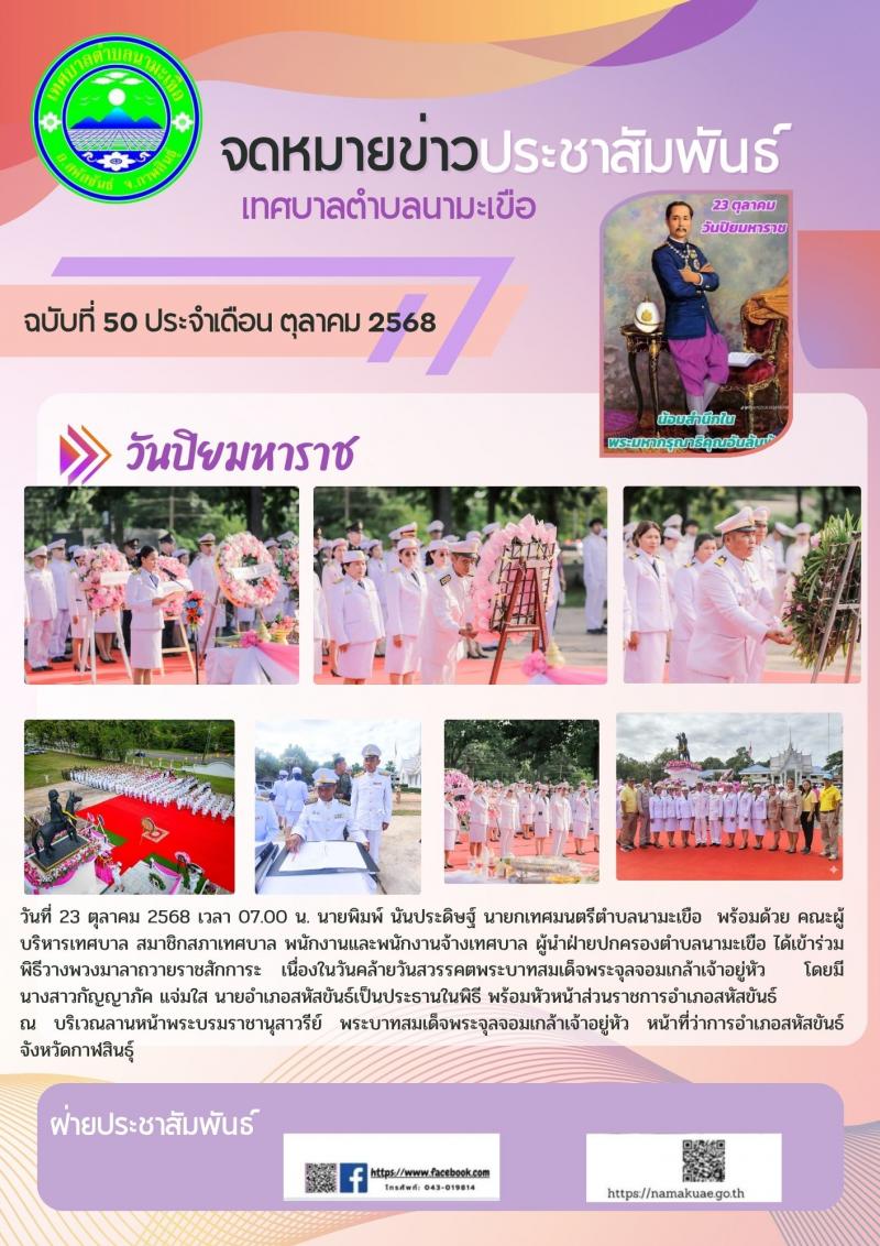 รายละเอียด : วันที่ 23 ตุลาคม 2568 เวลา 07.00 น. นายพิมพ์ นันประดิษฐ์ นายกเทศมนตรีตำบลนามะเขือ พร้อมด้วย คณะผู้บริหารเทศบาล สมาชิกสภาเทศบาล พนักงานและพนักงานจ้างเทศบาล ผู้นำฝ่ายปกครองตำบลนามะเขือ ได้เข้าร่วมพิธีวางพวงมาลาถวายราชสักการะ เนื่องในวันคล้ายวันสวรรคตพระบาทสมเด็จพระจุลจอมเกล้าเจ้าอยู่หัว โดยมี นางสาวกัญญาภัค แจ่มใส นายอำเภอสหัสขันธ์ เป็นประธานในพิธี พร้อมหัวหน้าส่วนราชการอำเภอสหัสขันธ์ ณ บริเวณลานหน้าพระบรมราชานุสาวรีย์ พระบาทสมเด็จพระจุลจอมเกล้าเจ้าอยู่หัว หน้าที่ว่าการอำเภอสหัสขันธ์ จังหวัดกาฬสินธ์ู