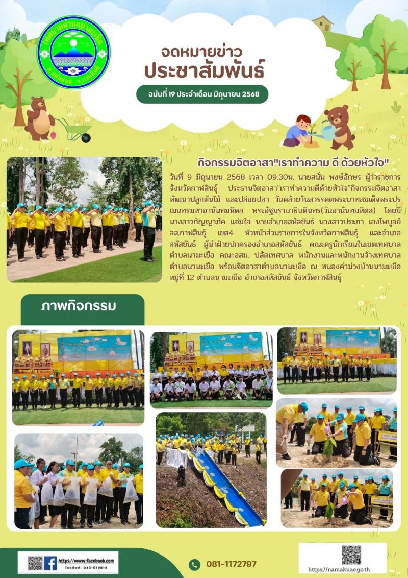 รายละเอียด : วันที่ 9 มิถุนายน 2568 เวลา09.30น. นายสนั่น พงษ์อักษร ผู้ว่าราชการจังหวัดกาฬสินธุ์ ประธานจิตอาสา"เราทำความดีด้วยหัวใจ"กิจกรรมจิตอาสาพัฒนาปลูกต้นไม้ และปล่อยปลา วันคล้ายวันสวรรคตพระบาทสมเด็จพระปรเมนทรมหาอานันทมหิดล พระอัฐมรามาธิบดินทร (วันอานันทมหิดล) โดยมีนางสาวกัญญาภัค แจ่มใส นายอำเภอสหัสขันธ์ นางสาวประภา เฮงไพบูลย์ สส.กาฬสินธุ์ เขต4 หัวหน้าส่วนราชการในจังหวัดกาฬสินธุ์ และอำเภอสหัสขันธ์ ผู้นำฝ่ายปกครองอำเภอสหัสขันธ์ คณะครูนักเรียนในเขตเทศบาลตำบลนามะเขือ อสม. ปลัดเทศบาล พนักงานและพนักงานจ้างเทศบาลตําบลนามะเขือ พร้อมจิตอาสาตำบลนามะเขือ ณ หนองคำม่วงบ้านนามะเขือ หมู่ที่ 12 ตำบลนามะเขือ อำเภอสหัสขันธ์ จังหวัดกาฬสินธุ์