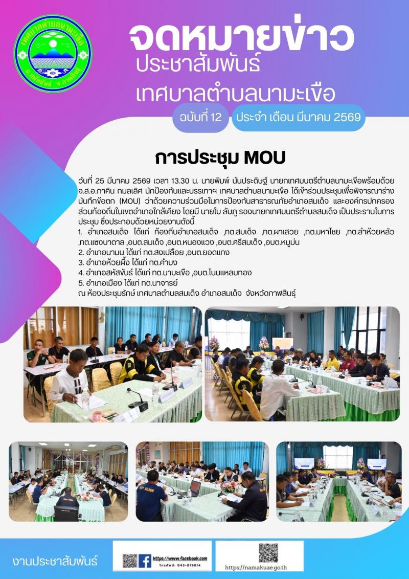 description วันที่ 25 มีนาคม 2569 เวลา 13.30 น. นายพินพ์ นันประดิษฐ์ นายกเทศมนตรีตำบลนามะเขือ พร้อมด้วย จ.ส.อ.ภาคิน กมลเลิศ นักป้องกันและบรรเทาฯ เทศบาลตำบลนานะเขือ ได้เข้าร่วมประชุมเพื่อพิจารณาร่างบันทึกข้อตก (MOU) ว่าด้วยความร่วนมือในการป้องกันสาธารณภัยอำเภอสมเด็จ และองค์กรปกครองส่วนท้องถิ่นในเขตอำเภอใกล้เคียง โดยมี นายใบ ลับภู รองนายกเทศมนตรีตำบลสมเด็จ เป็นประธานในการประชุม ซึ่งประกอบด้วยหน่วยงานดังนี้ 1. อำเภอสมเด็จ ได้แก่ ท้องถิ่นอำเภอสมเด็จ ทต.สมเด็จ ทต.ผาเสวย ทต.มหาไชย ทต.ลำหัวยหลัว ทต.แซงบาดาล อบต.สมเด็จ อบต.หมองแวง อบต.ศรีสมเด็จ อบต.หมูม่น 2. อำเภอนามน ได้แก่ ทต.สงเปลือย อบต.ยอดแกง 3. อำเภอหัวยผึ้ง ได้แก่ ทต.คำบง 4. อำเภอสหัสขันธ์ ได้แก่ ทต.นามะเขือ อบต.โนนแหลมทอง 5. อำเภอเมือง ได้แก่ ทต.นาจารย์ ณ ห้องประชุมรักษ์ เทศบาลตำบลสนเด็จ อำเภอสมเด็จ จังหวัดกาฬสินธุ์ person admin