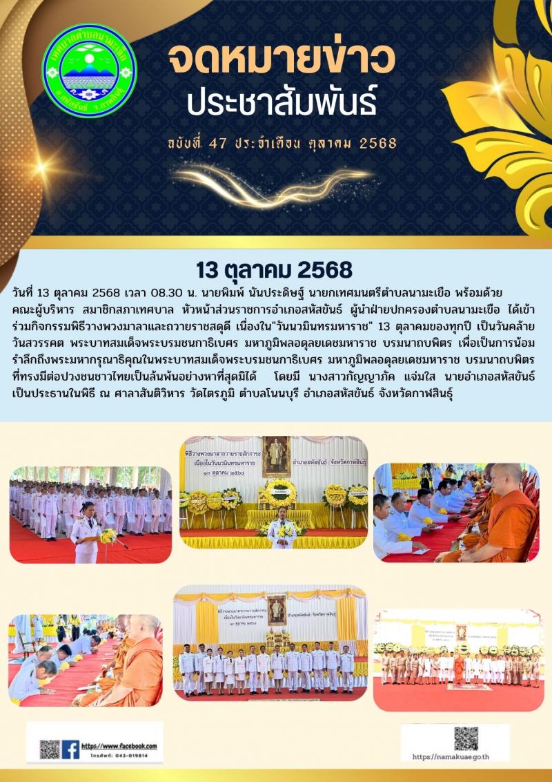 วันที่ 13 ตุลาคม 2568 เวลา 08.30 น. นายพิมพ์ นันประดิษฐ์ นายกเทศมนตรีตำบลนามะเขือ พร้อมด้วย คณะผู้บริหาร สมาชิกสภาเทศบาล หัวหน้าส่วนราชการอำเภอสหัสขันธ์ ผู้นำฝ่ายปกครองตำบล