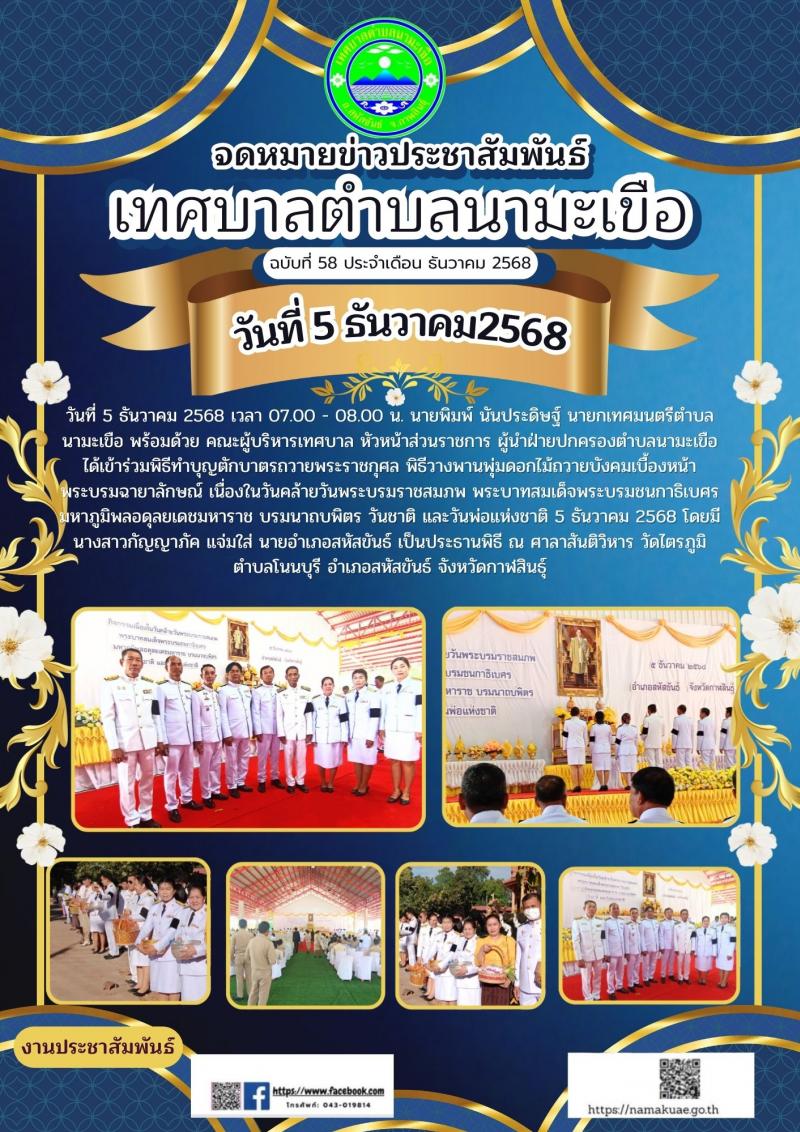 description วันที่ 5 ธันวาคม 2568 เวลา 07.00 - 08.00 น. นายพิมพ์ นันประดิษฐ์ นายกเทศมนตรีตำบลนามะเขือ พร้อมด้วย คณะผู้บริหารเทศบาล หัวหน้าส่วนราชการ ผู้นำฝ่ายปกครองตำบลนามะเขือได้เข้าร่วมพิธีทำบุญตักบาตรถวายพระราชกุศล พิธีวางพานพุ่มดอกไม้ถวายบังคนเบื้องหน้า พระบรมฉายาลักษณ์ เนื่องในวันคล้ายวันพระบรมราชสมภพ พระบาทสมเด็จพระบรมชนกาธิเบศรมหาภูมิพลอดุลยเดชมหาราช บรมนาถบพิตร วันชาติ และวันพ่อแห่งชาติ 5 ธันวาคม 2568 โดยมี นางสาวกัญญาภัค แจ่มใส่ นายอำเภอสหัสขันธ์ เป็นประธานในพิธี ณ ศาลาสันติวิหาร วัดไตรภูมิ ตำบลโนนบุรี อำเภอสหัสขันธ์ จังหวัดกาฬสินธุ์ person admin
