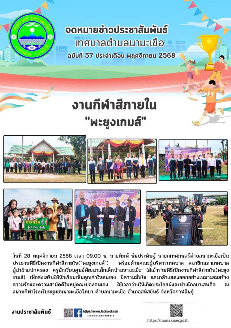 description วันที่่ 28 พฤศจิกานย 2568 เวลา 09.00 น. นายพิมพ์ นันประดิษฐ์ นายกเทศมนตรีตำบลนามะเขือเป็นประธานใพิธีเปิดงานกีฬาสีภายใน "พะยูงเกมส์" พร้อมด้วยคณะผู้บริหารเทศบาล สมาชิกสภาเทศบาล ผู้นำฝ่ายปกครอง ครูนักเรียนศูนย์พัฒนาเด็กเล็กบ้านนามะเขือ ได้เข้าร่วมพิธีเปิดงานกีฬาสีภายใน"พะยูงเกมส์" เพื่อส่งเสริมให้นักเรียนเห็นคุณค่าในตนเอง มีความมั่นใจ และกล้าแสดงออกอย่างเหมาะสมสร้างความรักความสามัคคีในหมู่คณะของตนเอง ใช้เวลาว่างให้เกิดประโยชน์และห่างไกลยาเสพติด ณ สนามกีฬาโรงเรียนชุมชนนามะเขือวิทยา ตำบลนามะเขือ อำเภอสหัสขันธ์ จังหวัดกาฬสินธุ์ person admin