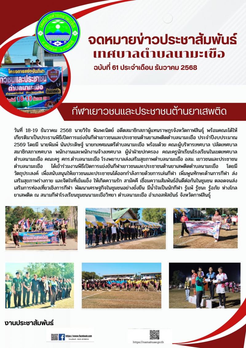 description วันที่ 18:19 ธันวาคม 2568 นายวิรัช พิมพะนิตย์ อดีตสมาชิกสภาผู้แทนราษฎรจังหวัดกาฬสินธุ์ พร้อมคณะได้ให้เกียรติมาเป็นประธามพิธีเปิดการแข่งขันกีฬาเยาวชนและประชาชนต้านยาเสพติดตำบลนามะเขือ ประจำปิงบประมาณ 2569 โดยมี นายพิมพ์ นันประดิษฐ์ นายกเทศมนตรีตำบลนามะเขือ พร้อมด้วย คณะผู้บริหารเทศบาล ปลัดเทศบาล สมาชิกสภาเทศบาล พนักงานและพนักงานจ้างเทศบาล ผู้นำฝ่ายปกครอง คณะครูนักเรียนโรงเรียนในเขตเทศบาลตำบลนามะเขือ คณะครู ศกร. ตำบลนามะเขือ โรงพยาบาลส่งเสริมสุขภาพตำบลนามะเขือ อสม. เยาวชนและประชาชนตำบลนามะเขือ ได้เข้าร่วมพิธีเปิดการแข่งขันกีฬาเยาวขนและประชาชนต้านยาเสพติดตำบลนามเขือ โดยมี วัตถุประสงค์เพื่อสนับสนุนให้เยาวชนและประชาชนได้ออกกำลังกายด้วยการเล่นกีฬา เพิ่มพูนทักษะด้านการกีฬา ส่งเสริมสุขภาพร่างกาย และจิตใจที่เข้มแข็ง ให้เกิดความรัก สามัคคี เชื่อมความสัมพันธ์อันดีต่อกันในชุมชน ตลอดจนส่งเสริมการท่องเที่ยวเชิงการกีฬา พัฒนาเศรษฐกิจในชุมชนอย่างยั่งยืน มีน้ำใจเป็นนักกีฬา รู้แพ้ รู้ชนะ รู้อภัย ห่างไกลยาเสพติด ณ สนามกีฬาโรงเรียนชุมชนนามะเขือวิทยา ตำบลนามะเขือ อำเภอสหัสขันธ์ จังหวัดกาฬสินธุ์ person admin