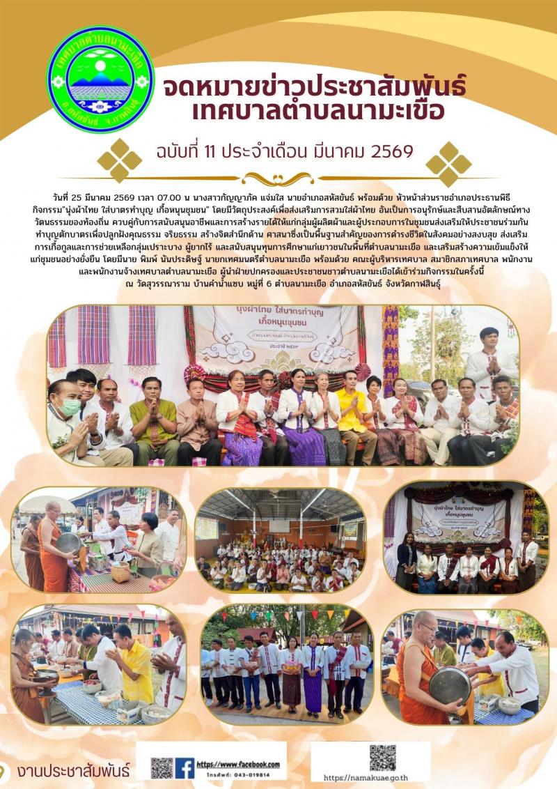 description วันที่ 25 มีนาคม 2560 เวลา 07:00 น นางสาวกัญญาภัค แจ่มใส นายอำเภอสหัสขันธ์ พร้อมด้วย หัวหน้าส่วนราชการอำเภอ เป็นประธามพิธี กิจกรรม"นุ่งผ้าไทย ใส่บาตรทำบุญ เกื้อหนุนชุมชน" โดยมีวัตถุประสงค์เพื่อส่งเสริมการสวมใส่ผ้าไทย อันเป็นการอนุรักษ์และสืบสานอัตลักษณ์ทาง วัฒนธรรมของท้องถิ่น ควบคู่กับการสนับสนุนอาชีพและการสร้างรายได้ให้แก่กลุ่มผู้ผลิตผ้าและผู้ประกอบการในชุมชนส่งเสริมให้ประชาชนร่วมกันทำบุญตักบาตรเพื่อปลูกฝังคุณธรรรม จริยธรรม สร้างจิตสำนึกด้าน ศาสนา ซึ่งเป็นพื้นฐานสำคัญของการดำรงชีวิตในสังคมอย่างสงบสุข ส่งเสริม การเกื้อกูลและการช่วยเหลือกลุ่มเปราะบาง ผู้ยากไร้ และสนับหนุนทุนการศึกษาแก่เยาวชนในพื้นที่ และเสริมสร้างความเข้มแข็งให้แก่ชุมชนอย่างยังยืน โดยมี นายพิมพ์ นันประดิษฐ์ นายกเทศมนตรีตำบลนามะเขือ พร้อมด้วย คณะผู้บริหารเทศบาล สมาชิกสภาเทศบาล พนักงานและพนักงานจ้างเทศบาลตำบลนามะเขือ ผู้นำฝ่ายปกครองและประชาชนชาวตำบลนามะเขือได้เข้าร่วมกิจกรรมในครั้งนี้ ณ วัดสุวรรณาราม บ้านคำน้ำแซบ หมู่ที่ 6 ตำบลนามะเขือ อำเภอสหัสขันธ์ จังหวัดกาฬสินธุ์ person admin