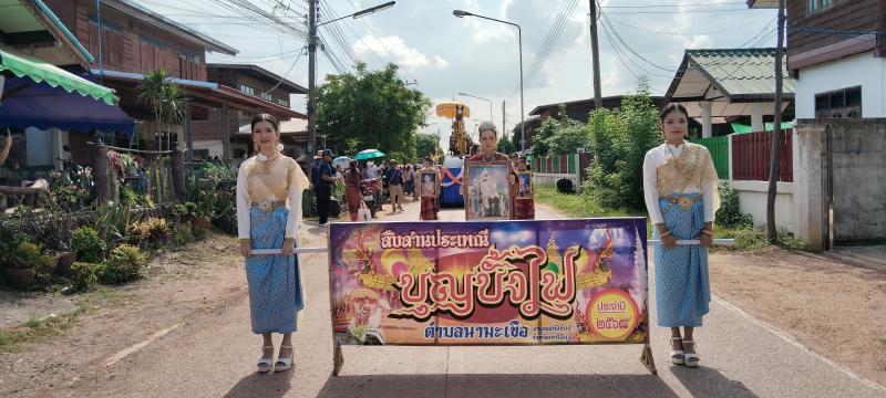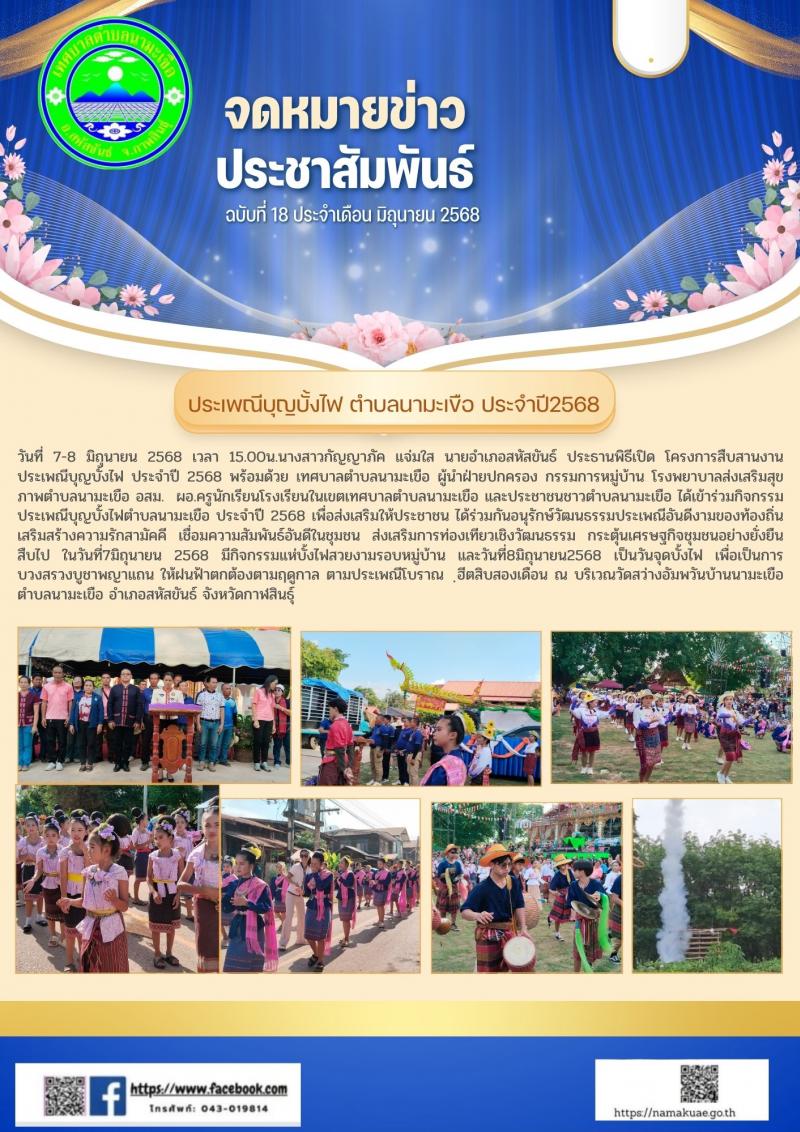 รายละเอียด : วันที่ 7- 8 มิถุนายน2568 เวลา 15.00น. นางสาวกัญญาภัค แจ่มใส นายอำเภอสหัสขันธ์ ประธานพิธีเปิด โครงการสืบสานงานประเพณีบุญบั้งไฟ ประจำปี 2568 พร้อมด้วย เทศบาลตำบลนามะเขือ ผู้นำฝ่ายปกครอง กรรมการหมู่บ้าน โรงพยาบาลส่งเสริมสุขภาพตำบลนามะเขือ อสม. คณะครูนักเรียนโรงเรียนในเขตเทศบาลตำบลนามะเขือ และประชาชนชาวตำบลนามะเขือ ได้เข้าร่วมกิจกรรมประเพณีบุญบั้งไฟตำบลนามะเขือ ประจำปี 2568 เพื่อส่งเสริมให้ประชาชน ได้ร่วมกันอนุรักษ์วัฒนธรรมประเพณีอันดีงามของท้องถิ่น เสริมสร้างความรักความสามัคคี เชื่อมความสัมพันธ์อันดีในชุมชน ส่งเสริมการท่องเทียวเชิงวัฒนธรรม กระตุ้นเศรษฐกิจชุมชนอย่างยั่งยืนสืบไป ในวันที่7 มิถุนายน 2568มีกิจกรรมแห่บั้งไฟสวยงามรอบหมู่บ้าน และวันที่8มิถุุนายน 2568 เป็นวันจุดบั้งไฟ เพื่อเป็นการบวงสรวงบูชาพญาแถน ให้ฝนฟ้าตกต้องตามฤดูกาล ตามประเพณีโบราณ ฮีตสิบสองเดือน ณ บริเวณวัดสว่างอัมพวันบ้านนามะเขือ ตำบลนามะเขือ อำเภอสหัสขันธ์ จังหวัดกาฬสินธุ์
