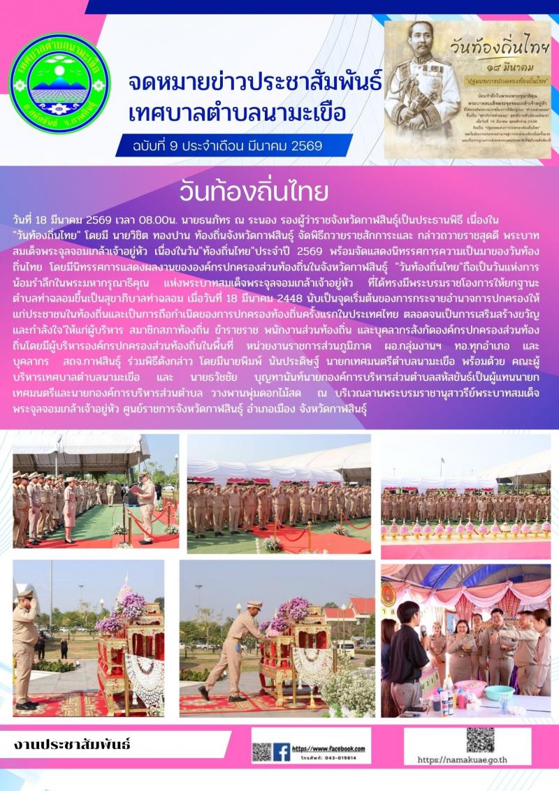 description วันที่ 18 มีนาคม 2569 เวลา 08.00น. นายธนภัทร ณ ระนอง รองผู้ว่าราชจังหวัดกาฬสินธุ์เป็นประธานพิธี เนื่องใน"วันท้องถิ่นไทย" โดยมี นายวิชิต ทองปาน ท้องถิ่นจังหวัดกาฬสินธุ์ จัดพิธีถวายราชสักการะและ กล่าวถวายราชสุดดี พระบาทสมเด็จพระจุลจอมเกล้าเจ้าอยู่หัว เนื่องในวัน "ท้องถิ่นไทย"ประจำปี 2569 พร้อมจัดแสดงนิทรรศการความเป็นมาของวันท้องถิ่นไทย โดยมีนิทรรศการแสดงผลงานขององค์กรปกครองส่วนท้องถิ่นในจังหวัดกาฬสินธุ์ "วันท้องถิ่นไทย"ถือเป็นวันแห่งการน้อมรำลึกในพระมหากรุณาธิคุณ แห่งพระบาทสมเด็จพระจุลจอมเกล้าเจ้าอยู่หัว ที่ได้ทรงมีพระบรมราชโองการให้ยกฐานะตำบลท่าฉลอมขึ้นเป็นสุขาภิบาลท่าฉลอม เมื่อวันที่ 18 มีนาคม 2448 นับเป็นจุดเริ่มต้นของการกระจายอำนาจการปกครองให้แก่ประชาชนในท้องถิ่นและเป็นการถือกำเนิดของการปกครองท้องถิ่นครั้งแรกในประเทศไทย ตลอดจนเป็นการเสริมสร้างขวัญและกำลังใจให้แก่ผู้บริหาร สมาชิกสภาท้องถิ่น ข้าราชการ พนักงานส่วนท้องถิ่น และบุคลากรสังกัดองค์กรปกครองส่วนท้องถิ่นโดยมีผู้บริหารองค์กรปกครองส่วนท้องถิ่นในพื้นที่ หน่วยงานราชการส่วนภูมิภาค ผอ.กลุ่มงานฯ ทอ.ทุกอำเภอ และบุคลากร สถจ.จังหวัดกาฬสินธุ์ ร่วมพิธีดังกล่าว โดยมีนายพิมพ์ นันประดิษฐ์ นายกเทศมนตรีตำบลนามะเขือ พร้อมด้วย คณะผู้บริหารเทศบาลตำบลนามะเขือ และ นายธวัชชัย บุญทานันท์นายกองค์การบริหารส่วนตำบลสหัสขันธ์เป็นผู้แทนนายกเทศมนตรีและนายกองค์การบริหารส่วนตำบล วางพานพุ่มดอกไม้สด ณ บริเวณลานพระบรมราชานุสาวรีย์พระบาทสมเด็จพระจุลจอมเกล้าเจ้าอยู่ห้ว ศูนย์ราชการจังหวัดกาฬสินธุ์ อำเภอเมือง จังหวัดกาฬสินธุ์ person admin