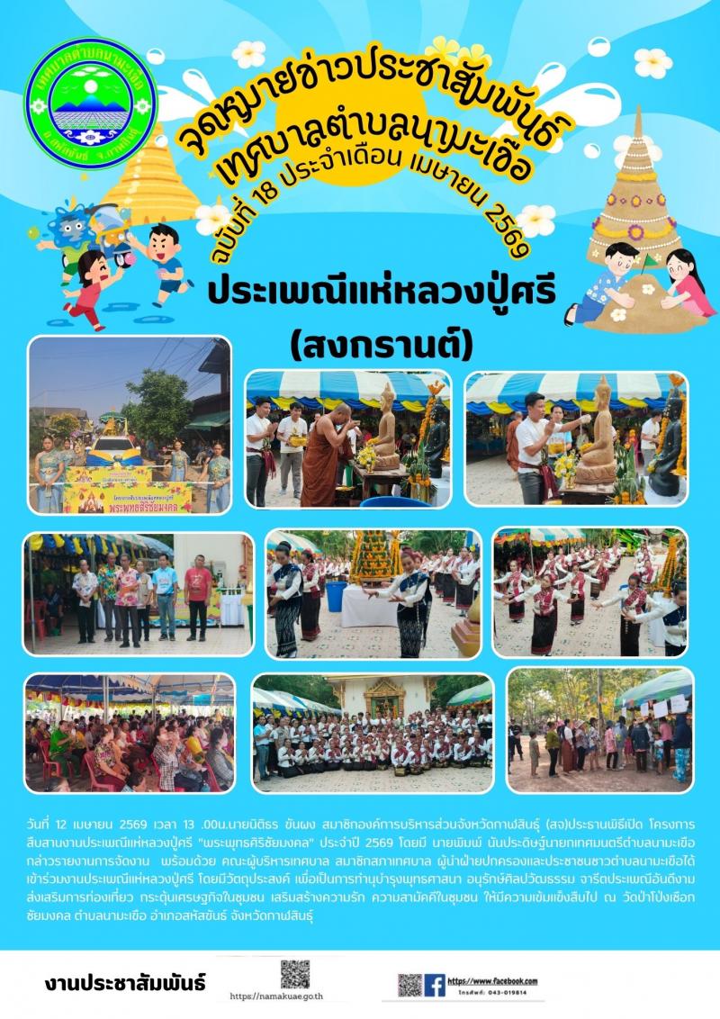 description วันที่ 12 เมษายน 2569 เวลา 13 .00น.นายนิติธร ขันผง สมาชิกองค์การบริหารส่วนจังหวัดกาฬสินธุ์ (สจ.) เป็นประธานพิธีเปิด โครงการสืบสานงานประเพณีแห่หลวงปู่ศรี "พระพุทธศิริชัยมงคล" ประจําปี 2569 โดยมี นายพิมพ์ นันประดิษฐ์นายกเทศมนตรีตำบลนามะเขือ กล่าวรายงานการจัดงาน พร้อมด้วย คณะผู้บริหารเทศบาล สมาชิกสภาเทศบาล ผู้นำฝ่ายปกครองและประชาชนชาวตำบลนามะเขือ ได้เข้าร่วมงานประเพณีแห่หลวงปู่ศรี โดยมีวัตถุประสงค์ เพื่อเป็นการทำนุบำรุงพุทธศาสนา อนุรักษ์ศิลปวัฒธรรม จารีตประเพณีอันดีงาม ส่งเสริมการท่องเที่ยว กระตุ้นเศรษฐกิจในชุมชน เสริมสร้างความรัก ความสามัคคีในชุมชน ให้มีความเข้มแข็งสืบไป ณ วัดป่าโป่งเชือกชัยมงคล ตำบลนามะเขือ อำเภอสหัสขันธ์ จังหวัดกาฬสินธุ์ person admin