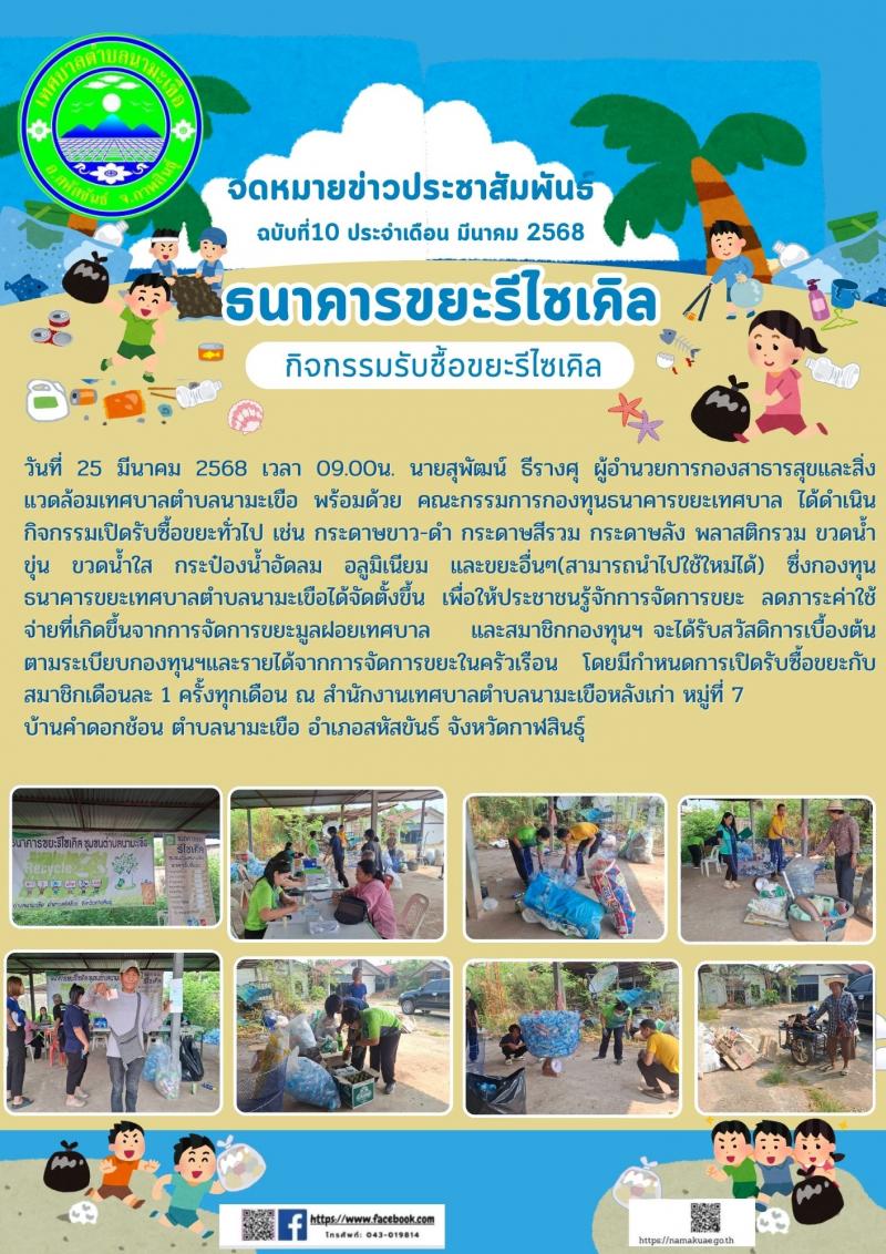 รายละเอียด : วันที่ 25 มีนาคม 2568 เวลา 09.00น.นายสุพัฒน์ ธีรางศุุ ผู้อำนวยการกองสาธารณสุขและสิ่งแวดล้อมเทศบาลตำบลนามะเขือ พร้อมด้วย คณะกรรมการกองทุนธนาคารขยะเทศบาล ได้ดำเนินกิจกรรมเปิดรับซื้อขยะทั่วไป เช่น กระดาษขาว-ดำ กระดาษสีรวม กระดาษลัง พลาสติกรวม ขวดน้ำขุ่น ขวดน้ำใส กระป๋องน้ำอัดลม อลูมิเนียม และขยะอื่นๆ(สามารถนำไปใช้ใหม่ได้) ซึ่งกองทุนธนาคารขยะเทศบาลตำบลนามะเขือได้จัดตั้งขึ้น เพื่อให้ประชาชนรู้จักการจัดการขยะ ลดภาระค่าใช้จ่ายที่เกิดขึ้นจากการจัดการขยะมูลฝอยเทศบาล และสมาชิกกองทุนฯ จะได้รับสวัสดิการเบื้องต้นตามระเบียบกองทุนฯ และรายได้จากการจัดการขยะในครัวเรือน โดยมีกำหนดการเปิดรับซื้อขยะกับสมาชิกเดือนละ1ครั้งทุกเดือน