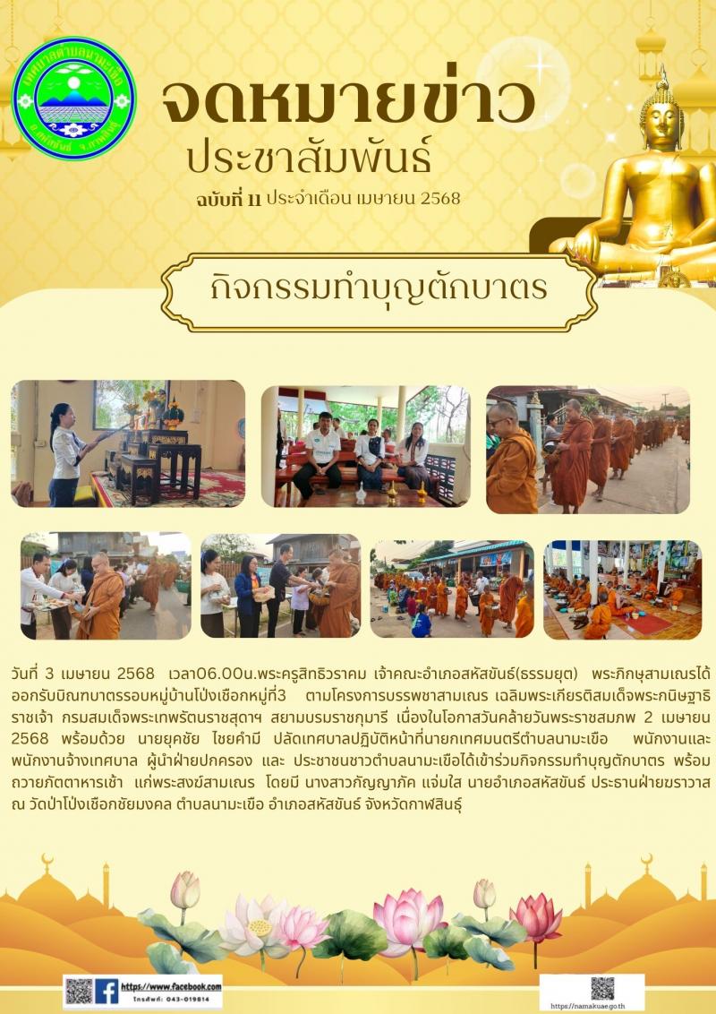 รายละเอียด : วันที่ 3 เมษายน 2568 เวลา 06.00น. พระครูสิทธิวราคม เจ้าคณะอำเภอสหัสขันธ์(ธรรมยุต) พระภิกษุสามเณรได้ออกรับบิณฑบาตรรอบหมู่บ้านโป่งเชือกหมู่ที่3 ตามโครงการบรรพชาสามเณร เฉลิมพระเกียรติสมเด็จพระกนิษฐาธิราชเจ้า กรมสมเด็จพระเทพรัตนราชสุดาฯ สยามบรมราชกุมารี เนื่องในโอกาสวันคล้ายวันพระราชสมภพ2 เมษายน 2568 พร้อมด้วย นายยุคชัย ไชยคำมี ปลัดเทศบาลปฎิบัติหน้าที่นายกเทศมนตรีตำบลนามะเขือ พนักงานและพนักงานจ้างเทศบาล ผู้นำฝ่ายปกครอง และประชาชนชาวตำบลนามะเขือได้เข้าร่วมกิจกรรมทำบุญตักบาตร พร้อมถวายภัตตาหารเช้า แก่พระสงฆ์สามเณร โดยมี นางสาวกัญญาภัค แจ่มใส นายอำเภอสหัสขันธ์ ประธานฝ่ายฆราวาส ณ วัดป่าโป่งเชือกชัยมงคล