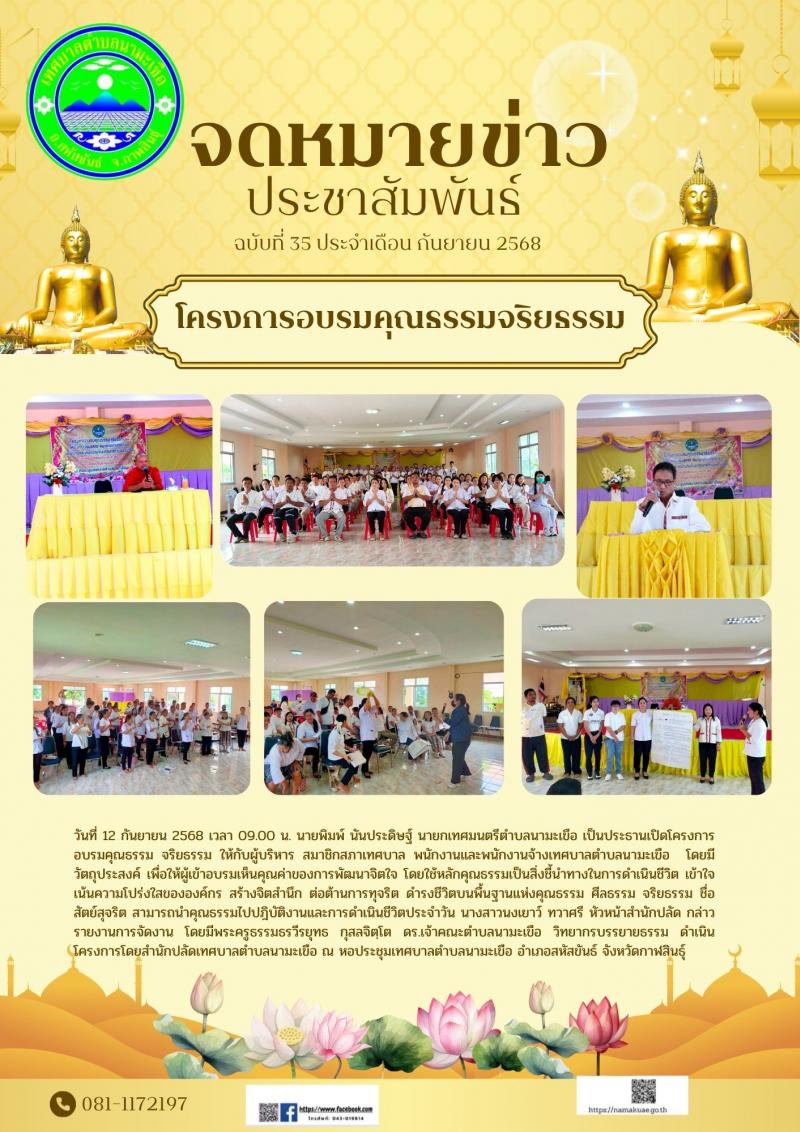 รายละเอียด : วันที่ 12 กันยายน 2568 เวลา 09.00 น. นายพิมพ์ นันประดิษฐ์ นายกเทศมนตรีตำบลนามะเขือ เป็นประธานเปิด โครงการอบรมคุณธรรม จริยธรรม ให้กับผู้บริหาร สมาชิกสภาเทศบาล พนักงานและพนักงานจ้างเทศบาลตำบลนามะเขือ โดยมี วัตถุประสงค์ เพื่อให้ผู้เข้าอบรมเห็นคุณค่าของการพัฒนาจิตใจ โดยใช้หลักคุณธรรมเป็นสิ่งชี้นำทางในการดำเนินชีวิต เข้าใจเน้นความโปร่งใสขององค์กร สร้างจิตสำนึก ต่อต้านการทุจริต ดำรงชีวิตบนพื้นฐานแห่งคุณธรรม ศีลธรรม จริยธรรม ชื่อสัตย์สุจริต สามารถนำคุณธรรมไปปฎิบัติงานและการดำเนินชีวิตประจำวัน