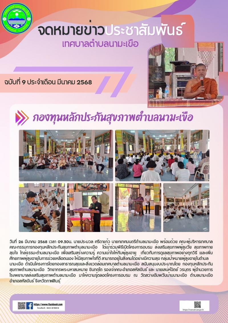 รายละเอียด : วันที่ 26 มีนาคม 2568 เวลา 09.30น. นายประมวล ศรีดาแก้า นายกเทศมนตรีตำบลนามะเขือ พร้อมด้วย คณะผู้บริหารเทศบาล คณะกรรมการกองทุนหลักประกันสุขภาพตำบลนามะเขือ ได้เข้าร่วมพิธีเปิดโครงการอบรม ส่งเสริมสุขผู้สูงวัย สุขภาพกาย สุขใจ ใกล้ธรรมะตำบลนามะเขือ เพื่อเสริมสร้างความรู้ ความเข้าใจให้กับผู้สูงอายุ เกี่ยวกับการดูแลสุขอย่างถูกวิธี และเพิ่มศักยภาพผู้สูงอายุในการช่วยเหลือตนเอง ให้มีสุขภาพใจที่ดี สามารถอยู่ในสังคมได้อย่างมีความสุข กลุ่มเป้าหมายผู้สูงอายุในตำบลนามะเขือ ดำเนินโครงการโดยกองสาธารณสุขและสิ่งแวดล้อมเทศบาลตำบลนามะเขือ สนับสนุนงบประมาณโดย กองทุนหลักประกันสุขถาพตำบลนามะเขือ วิทยากร พระมหาสมหมาย ชินทตฺโต รองเจ้าคณะอำเภอสหัสขันธ์ และ นายเสน่ห์นิตย์ วรบุตร ผู้อำนวยการโรงพยาบาลส่งเสริมสุขภาพตำบลนามะเขือ มาให้ความรู้ตลอดโครงการอบรม ณ วัดสว่างอัมพวันบ้านนามะเขือ ตำบลนามะเขือ อำเภอสหัสขันธ์ จังหวัดกาฬสินธุ์