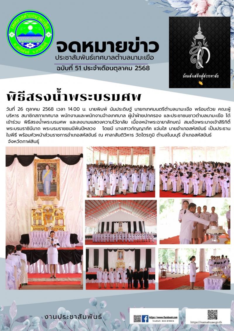 วันที่ 26 ตุลาคม 2568 เวลา 14.00 น. นายพิมพ์ นันประดิษฐ์ นายกเทศมนตรีตำบลนามะเขือ พร้อมด้วย คณะผู้ บริหาร สมาชิกสภาเทศบาล พนักงานและพนักงานจ้างเทศบาล ผู้นำฝ่ายปกครอง และประชาชนชาวตำบลนามะเขือ ได้ เข้าร่วม พิธีสรงน้ำพระบรมศพ และลงนามแสดงความไว้อาลัย เบื้องหน้าพระฉายาลักษณ์ สมเด็จพระนางเจ้าสิริกิติ์ พระบรมราชินีนาถ พระบรมราชชนนีพันปีหลวง โดยมี นางสาวกัญญาภัค แจ่มใส นายอำเภอสหัสขันธ์ เป็นประธาน ในพีธี พร้อมหัวหน้าส่วนราชการอำเภอสหัสขันธ์ ณ ศาลาสันติวิหาร วัดไตรภูมิ ตำบลโนนบุรี อำเภอสหัสขันธ์ จังหวัดกาฬสินธุ์