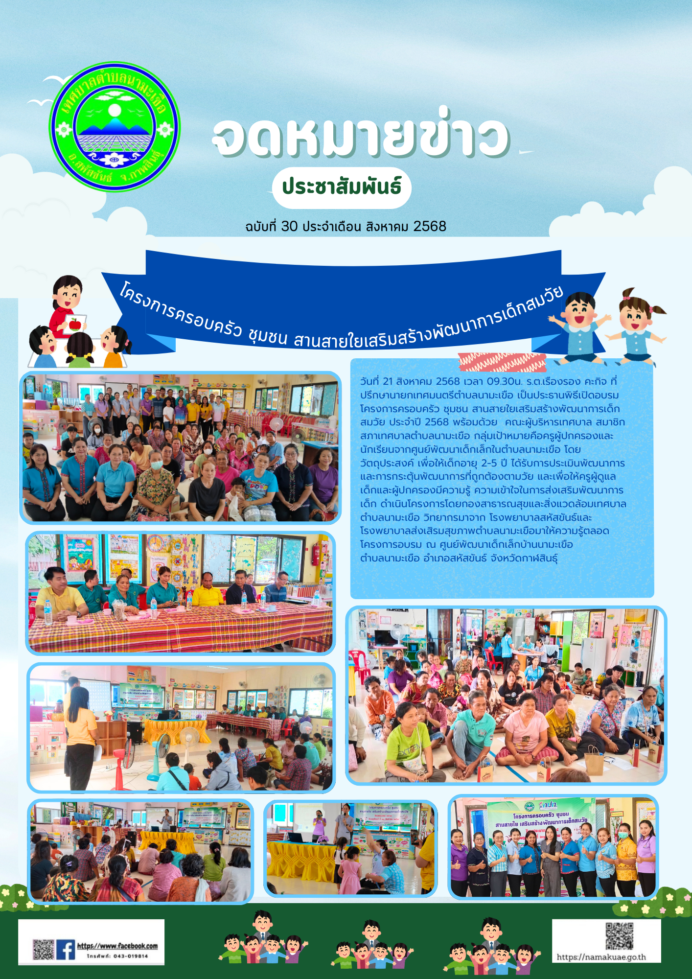 รายละเอียด : วันที่ 21 สิงหาคม 2568 เวลา 09.30น. ร.ต.เรืองรอง คะกิจ ที่ปรึกษานายกเทศมนตรีตำบลนามะเขือ เป็นประธานพิธีเปิดอบรม โครงการครอบครัว ชุมชน สานสายใยเสริมสร้างพัฒนาการเด็กสมวัย ประจำปี 2568 พร้อมด้วย คณะผู้บริหารเทศบาล สมาชิกสภาเทศบาลตำบลนามะเขือ กลุ่มเป้าหมายคือครูผู้ปกครองและนักเรียนจากศูนย์พัฒนาเด็กเล็กในตำบลนามะเขือ โดยมีวัตถุประสงค์ เพื่อให้เด็กอายุ 2-5 ปี ได้รับการประเมินพัฒนาการและการกระตุ้นพัฒนาการที่ถูกต้องตามวัยและเพื่อให้ครูผู้ดูแลเด็กและผู้ปกครองมีความรู้ ความเข้าใจในการส่งเสริมพัฒนาการเด็ก ดำเนินโครงการโดยกองสาธารณสุขและสิ่งแวดล้อมเทศบาลตำบลนามะเขือ วิทยากรมาจากโรงพยาบาลสหัสขันธ์และโรงพยาบาลส่งเสริมสุขภาพตำบลนามะเขือมาให้ความรู้ตลอดโครงการอบรม ณ ศูนย์พัฒนาเด็กเล็กบ้านนามะเขือ ตำบลนามะเขือ อำเภอสหัสขันธ์ จังหวัดกาฬสินธุ์